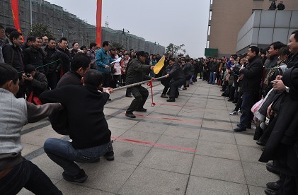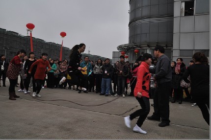 随着礼炮齐鸣,联谊会正式开始。上午进行的是体育比赛项目,投飞镖、跳绳、三人篮球赛、扑克比赛、踩气球等,选手们你追我赶,赛得是友谊,玩的是开心。呐喊助威声洋溢着阵阵激情,欢声笑语在公司广场的上空久久飘荡。