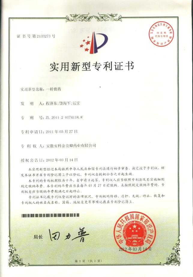 为加强科技创新和知识产权保护,提升企业核心竞争力,2011年,公司共提交六项专利申请,分别为“一种膏药”、 “一种膏药制作设备”、“一种橡胶膏涂胶车烘箱温度的控制系统”、“一种橡胶膏横切机”、“一种橡胶膏复卷设备”和“一种药液灌装设备”。自今年3月份开始,已陆续获得国家知识产权局授予的实用新型专利证书。另有两项外观设计专利也已获得证书。