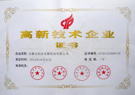 我公司近日收到由安徽省科学技术厅、安徽省财政厅、安徽省国家税务局、安徽省地方税务局联合颁发的《高新技术企业证书》,证书编号:GF201234000126,发证时间:2012 年 10 月 31日,有效期:三年。