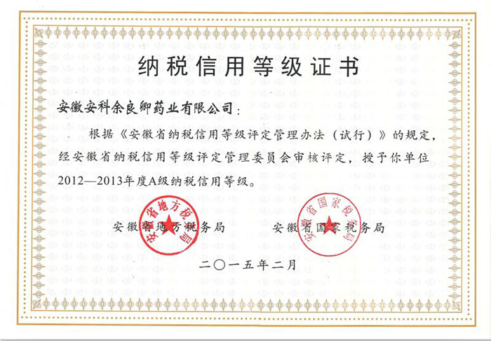 近日,我公司获得由省地税局、国税局联合颁发的安徽省2012-2013年度A级纳税信用等级证书。纳税信用等级A级是税务部门对企业诚信经营、依法纳税、贡献社会的行为给予肯定,对社会信用体系的建立起到极大的推动作用。同时,公司树立了良好的企业形象和优质的企业商誉。
