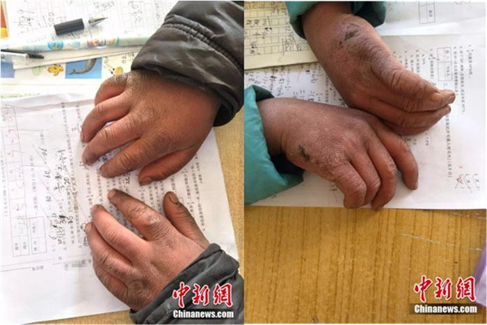 这两张是男孩的校长付恒上传到网上的照片,一双被冻伤的小手,像经过了数年劳动后的手掌一般沧桑,一条条被冻伤的裂痕再次令人心痛。尽管如此艰难,在这双满是伤痕的小手下面是一张得分99分的试卷,看到这里让人欣慰,可谓“天大寒、砚冰坚,手指不可屈伸,弗之怠”。一个少年能将求学做到极致,丝毫不在乎其中的伤痛,可见在他瘦弱的身材下是一颗自强不息的上进心。