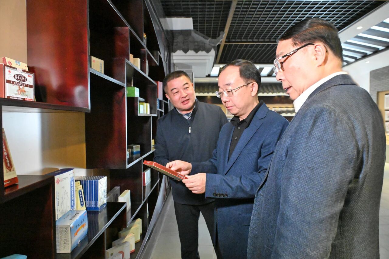 孟景伟书记一行首先参观了hjc888黄金城企业历史展厅,在一幅幅老照片、一件件历代产品实物与荣誉证书前驻足察看。宋礼华董事长详细介绍了企业自 1739 年创立以来的发展脉络,从传统中医药技艺的传承坚守,到融入安科生物集团后的创新突破,系统阐述了这一 “中华老字号” 近三个世纪来的历史积淀与时代价值。孟景伟不时提问,深入了解企业在不同发展阶段的核心产品、工艺特色,以及如何将家国情怀融入品牌发展,对企业深耕中医药领域、讲好安庆本土品牌故事的思路给予肯定。