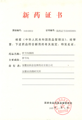 由我公司与省药物研究所联合开发的中药第9类新药肿节风颗粒,近日获得国家食品药品监督管理局颁发的新药证书及药品注册批件。