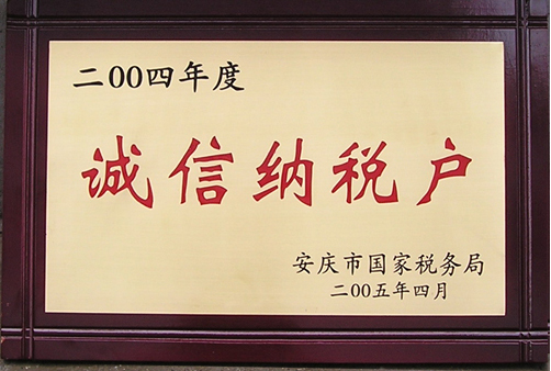 近日,安庆市国家税务局有关领导专程来到公司,将“2004年度诚信纳税户”的匾额授予公司,以表彰公司长期以来在诚信经营、按章纳税方面的突出表现。 据悉,我公司是安庆市经济开发区首家获此殊荣的企业。